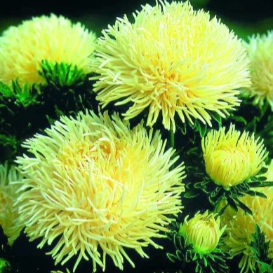 Астра жёлтая «Золотая» — многолетний, морозостойкий садовый представитель с насыщенными золотисто-жёлтыми соцветиями. Кусты крепкие, высотой 75–80 см, с густой зелёной листвой. Соцветия 8–10 см в диаметре, с язычковыми лепестками, скрученными в трубочку и немного загнутыми внутрь. Цветение средних сроков, обильное и регулярное; аромат мягкий, ненавязчивый.