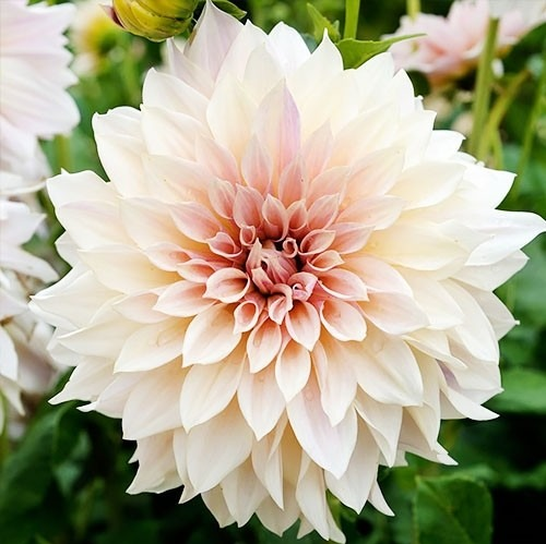 Георгин Кафе О Лейт (Cafe au Lait) – это изысканный сорт, который завораживает своими крупными, махровыми цветками нежного кремово-розового оттенка. Этот сорт георгина идеально подходит для создания элегантных цветочных композиций и букетов, а также станет ярким акцентом в вашем саду.