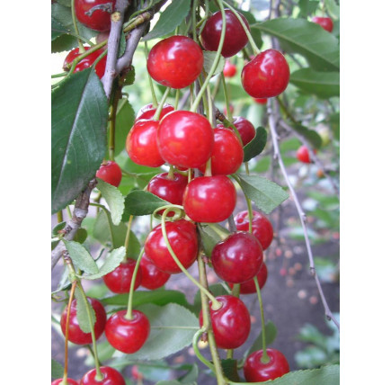 Плоды созревают рано, мелкие (около 3 г), округлой формы с красной кожицей и розовой сочной мякотью. Вкус десертный, кисло‑сладкий; косточка легко отделяется. Скороплодность средняя, урожайность — выше средней, назначение универсальное.